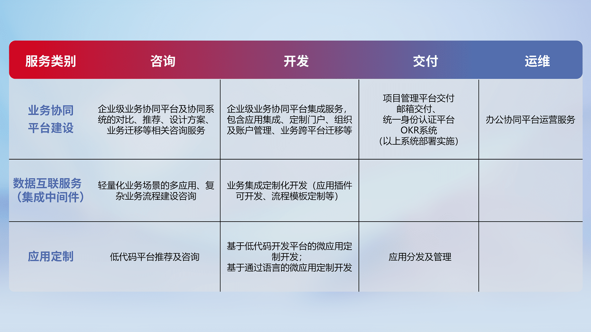 针对钉钉、、、、企微、、、、IDaas等平台级产品提供产品的规划、、方案、、交付、、、定制化开发等服务,,,实现如统一协同办公、、、智能客户服务、、、混合会议管理、、智能数据查询、、、、等业务场景,,,实现数字化转型。。。
